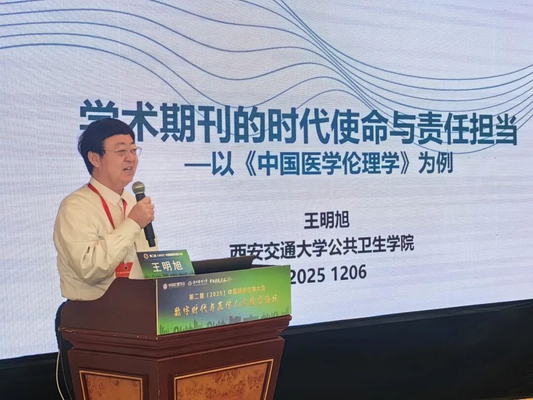 西安交通大学医学部公共卫生学院卫生政策与管理学系主任、《中国医学伦理学》杂志主编王明旭教授以《学术期刊的时代使命与责任担当》为题,分享了在全球变局与数字时代交织的背景下,学术期刊需立足“四个面向”“四个自信”,扛起构建中国特色哲学社会科学体系、传播中华文明的时代使命的心得体会。他表示,当前《中国医学伦理学》秉持着一贯的办刊宗旨,以共建、共赢、共享的理念打造大编辑部,形成“一体两翼,多元渠道”的发展模式。在未来,杂志社将重点围绕医学伦理学伦理与方法研究、医患命运共同体构建、临床伦理、健康伦理学等方向设置选题,持续以高质量内容引领学术前沿,助力中国医学伦理学话语体系建设与国际传播,为健康中国战略提供学理支撑。