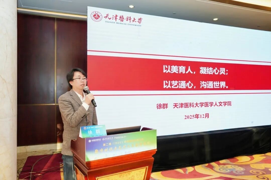 天津医科大学医学人文学院副院长徐群教授以《以美育人,凝结心灵;以艺通心,沟通世界》为题作分享。他指出,美育是医学人文的重要载体,能滋养医学生共情能力与生命感知力。他以天津医科大学为例,分享了学校美育中心与文化传承研究中心的实践经验,结合美学史论、艺术鉴赏、实践体验公共课程,把品牌活动融入育人体系,让医学生在艺术体验中触摸人文温度,同时依托校史馆、朱宪彝纪念馆等载体,推动美育与医学深度融合,构建全方位育人体系。