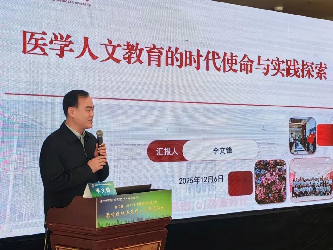 新疆医科大学人文学院党委书记李文锋以《医学人文教育的时代使命与实践探索》为题进行了分享,他指出,医学人文教育是响应“健康中国”战略的关键举措,当前全国大部分本科医学院校已设独立人文学院,形成交叉学科布局与多元课程体系,但仍面临课程规划不足、师资结构待优化等问题,基于此提出“四位一体”理念与“知—信—行”一体化育人创新路径。他分享了新疆医科大学基于知信行的实践探索和经验成效为例,呼吁各医学院校深化“医文融合”改革,协同完善医学人文教育体系,为培养兼具精湛技艺与人文情怀的卓越医学类人才、助力健康中国建设提供支撑。