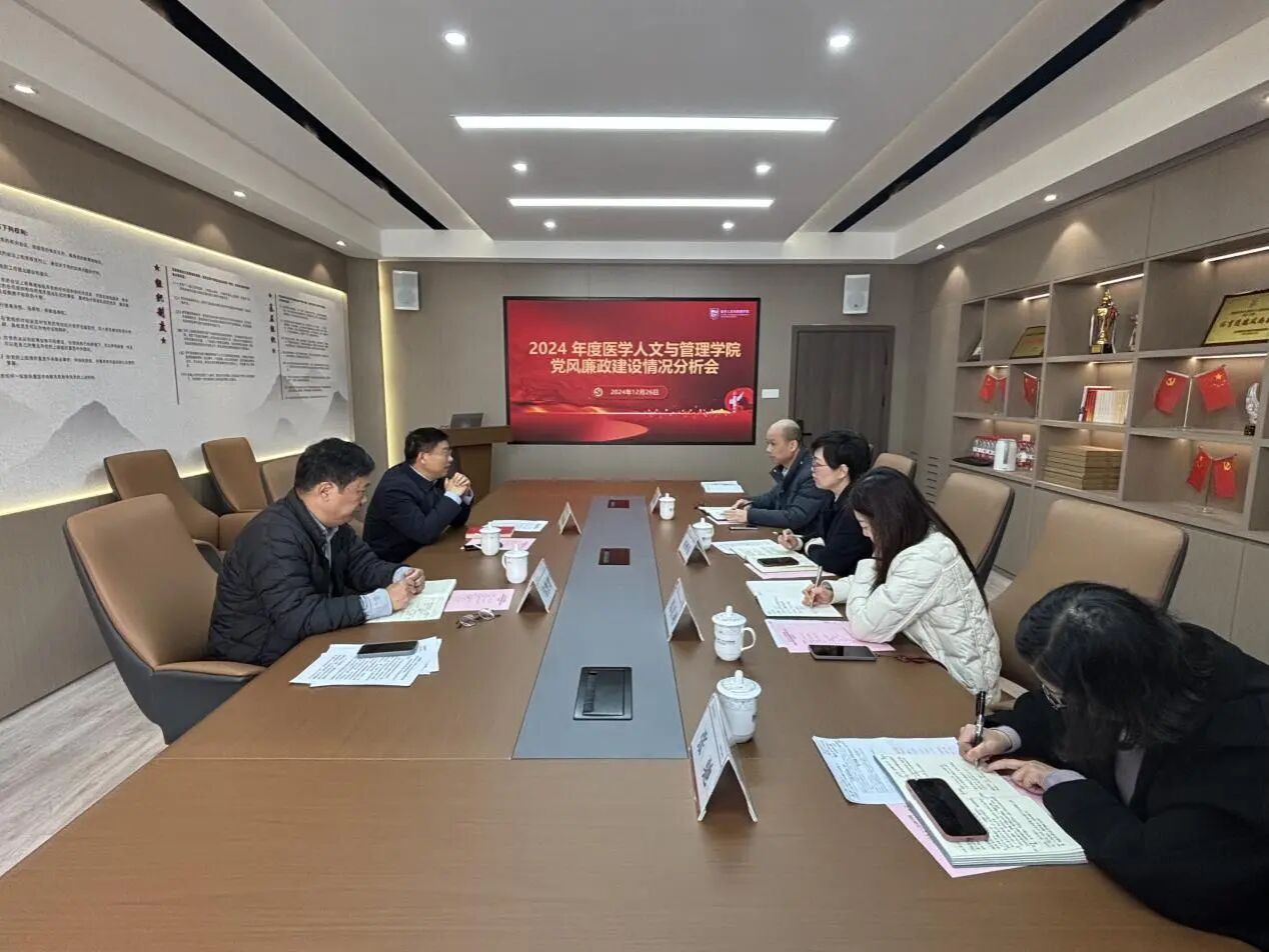 12月26日,医学人文与管理学院召开2024年度党风廉政建设情况分析会。校党委副书记章成斌出席会议并发表讲话,医学人文与管理学院党委书记马洪君主持会议,学院党委领导班子成员参加会议。
